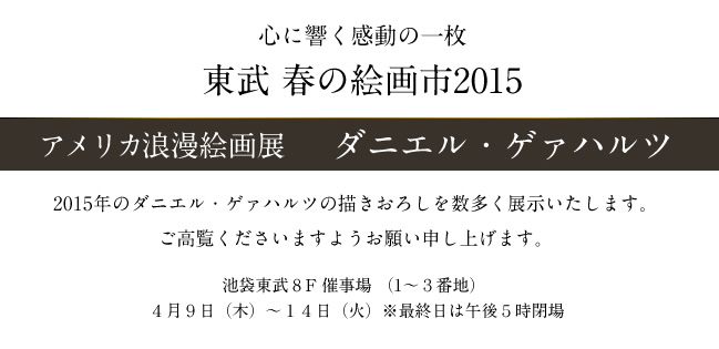 ■ 更新情報 >> バックナンバーはこちらから >> 2018年4月6日 東武春の絵画市2018 ダニエル・ゲァハルツ油絵展(2018/4/19-24) >> 2018年2月5日 徐 邦寧 来日絵画展(2018/2/15-21) >> 2017年4月6日 ダニエル・ゲァハルツ 2017年描き下ろし作品 >> 2017年4月6日 ダニエル・ゲァハルツ絵画展(2017/5/4-10) >> 2017年4月6日 東武春の絵画市2017 ニコル・クラッセン絵画展 (2017/4/20-25)
